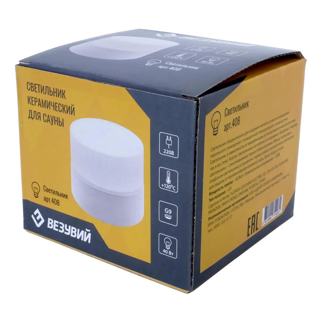 Светильник Везувий для сауны, цвет: Белый, Шайба. Термостойкий влагозащищенный светильник для бани в парилку. Корпус из керамики, плафон из матового термостойкого стекла. Класс защиты IP54, температура до +120°C.
