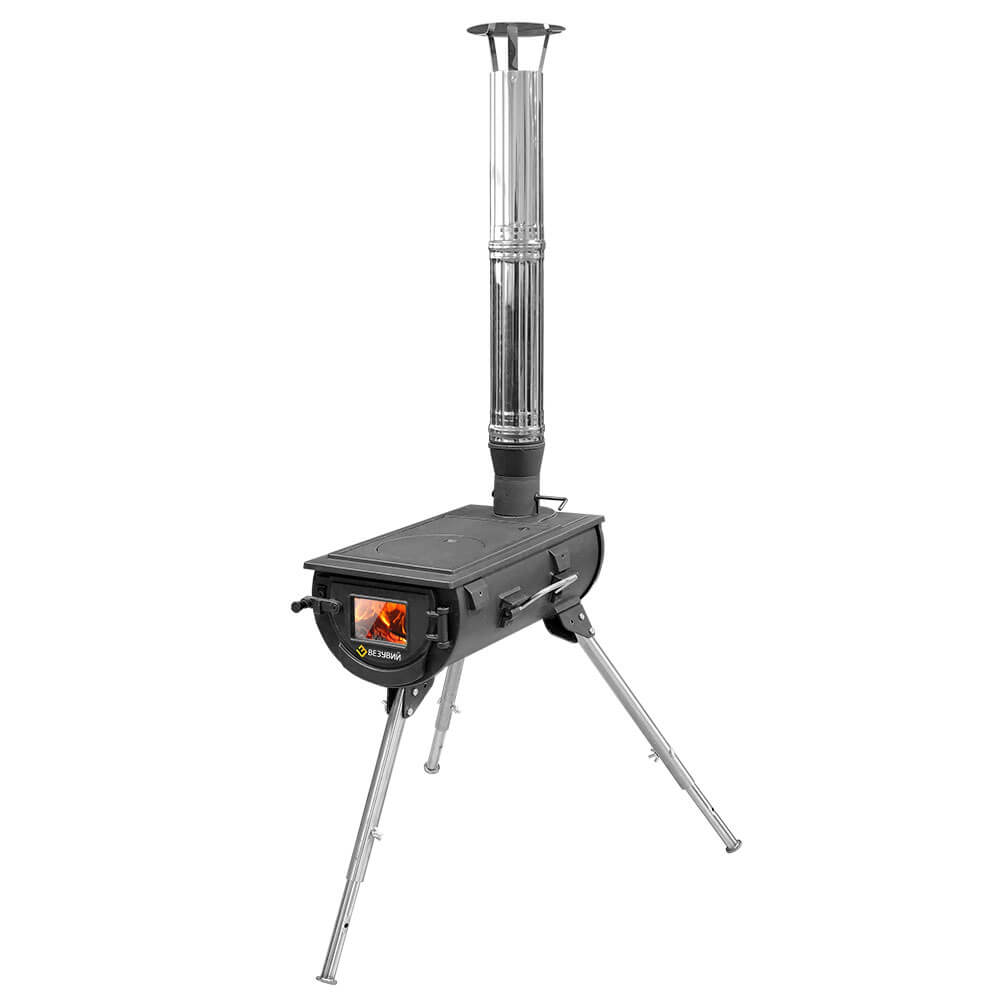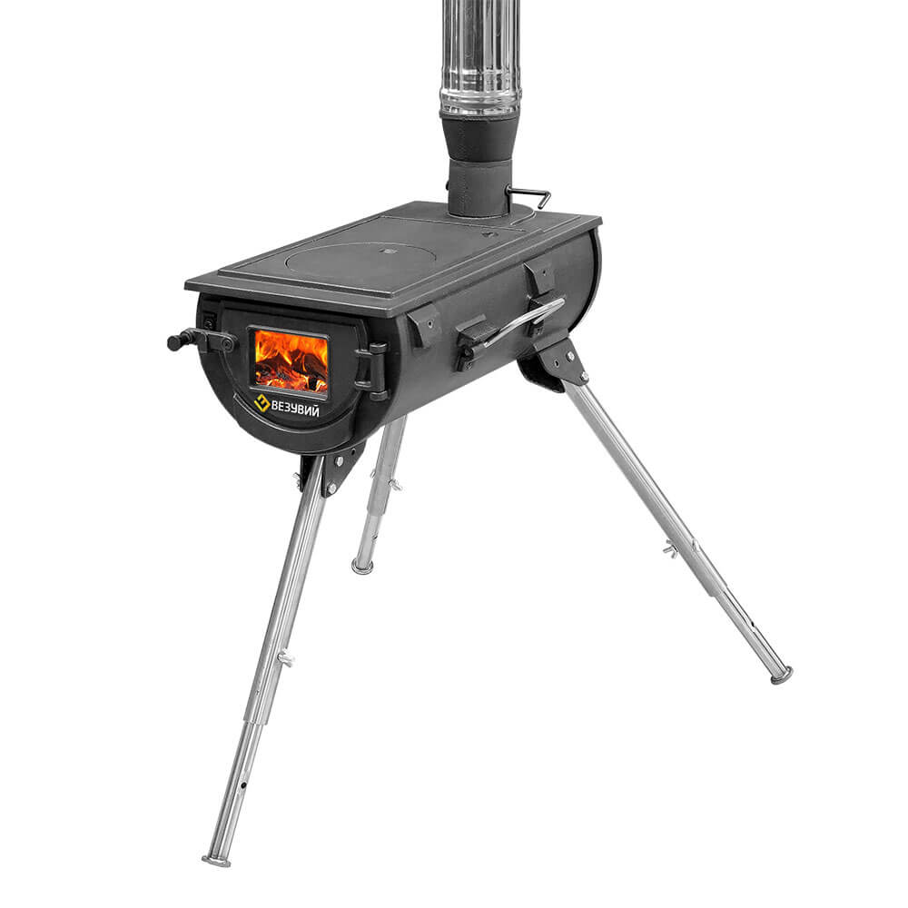 Походная печь на складывающихся ножках – Везувий Travel – печь со стеклом, с варочной плитой, возможно установка дополнительных плит и решеток -гриль.
