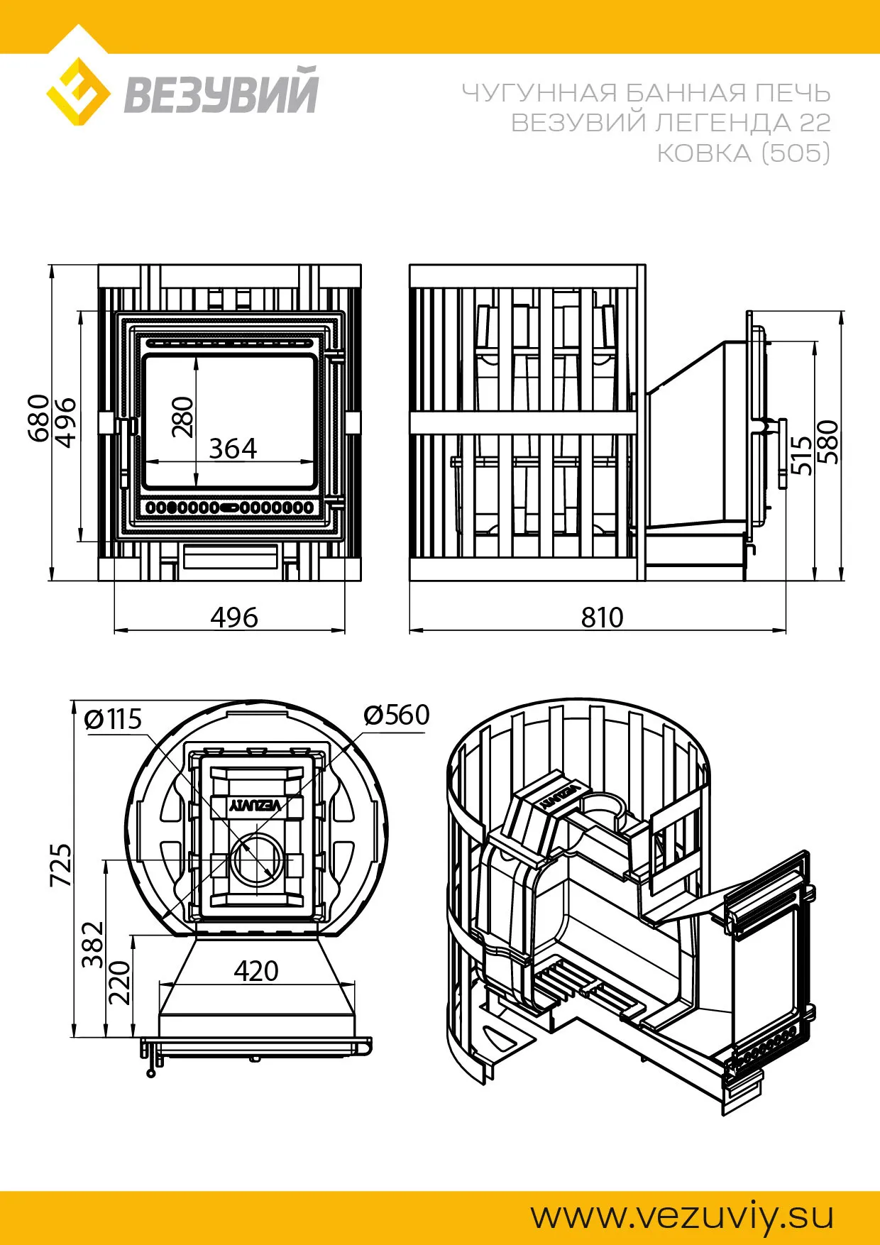 Печь ВЕЗУВИЙ Легенда Ковка 22 (505) — чугунная печь для бани на дровах. Объем парной 12-24 м³. Топка из чугуна с болтовым соединением и керамическим шнуром. Открытая каменка на 180 кг. Чугунная дверца с жаропрочным стеклом. Конвектор сетка ковка.