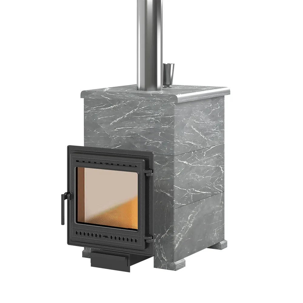 Комплект "Легенда Русский пар 18 (505)" NEXT Талькохлорит, S-40. Чугунная печь для бани в камне. Банная печь в облицовке из талькохлорита. Дровяная банная печь с закрытой каменкой для пара. Объем парной до 18 м³.