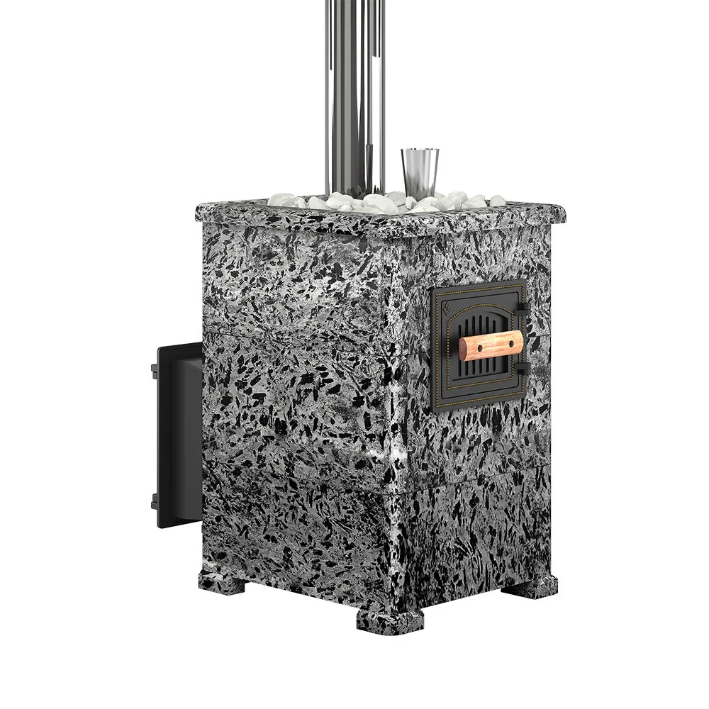 Данную модель печи отличает от аналогов то, что закрытая каменка расположена внутри топки. Это позволяет максимально быстро и хорошо прогревать камни, которые расположены внутри каменки. На камни через специальную трубку с отверстиями поддается вода, которая моментально испаряется, превращаясь в мелкодисперсный пар.