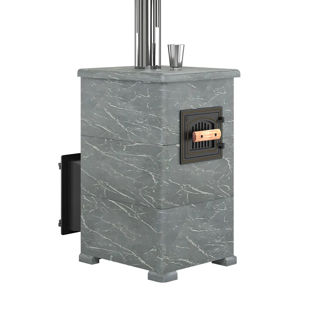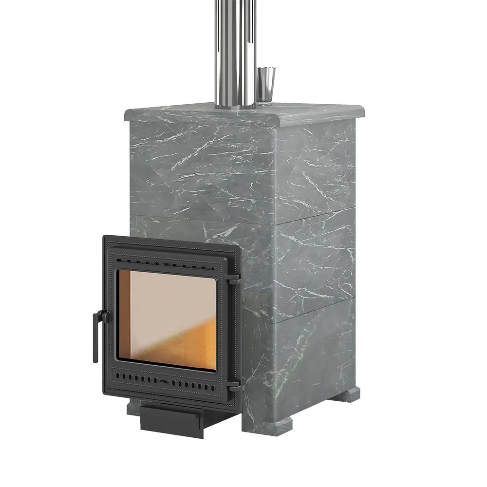 Комплект "Легенда Русский пар 24 (505)" NEXT Талькохлорит, S-40. Чугунная печь для бани в камне с закрытой каменкой. Дровяная банная печь для парной 12-24 м³. Банная печь в облицовке из талькохлорита.