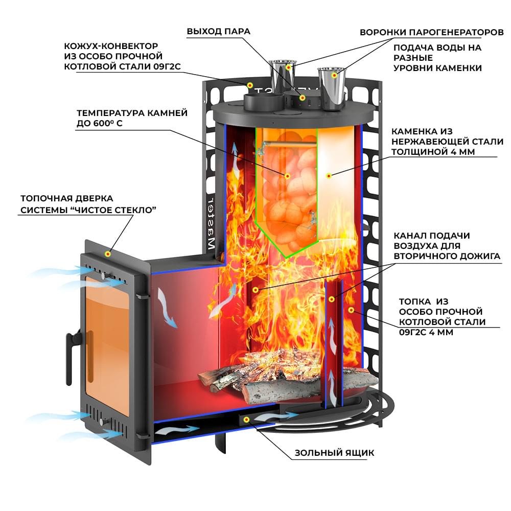 Конструкция печи включает в себя закрытую каменку из нержавейки марки AISI-430 толщиной 4 мм, расположенную в верхней части топки. Каменка размещена прямо на пути пламени и дымовых газов, что позволяет нагреть камни до температур свыше 600 градусов по Цельсию.