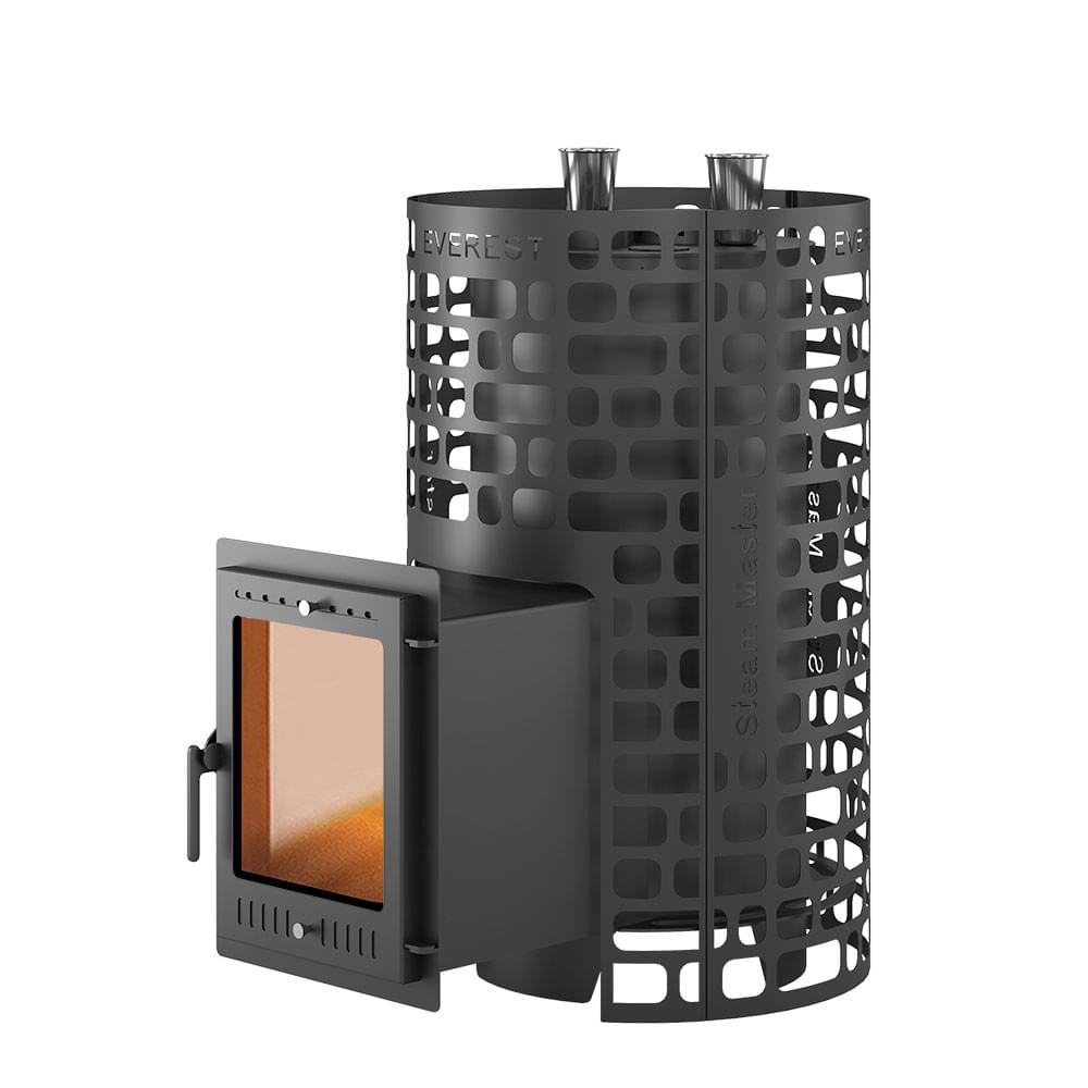 Печь для бани на дровах из прочной котловой стали (09Г2С) Эверест "Steam Master" 38 (320М), с топочным выносом, с сеткой-конвектором, с открытой и закрытой каменками на 210 кг и 65 кг камней, рассчитана на парную объемом от 24 до 44 м3.