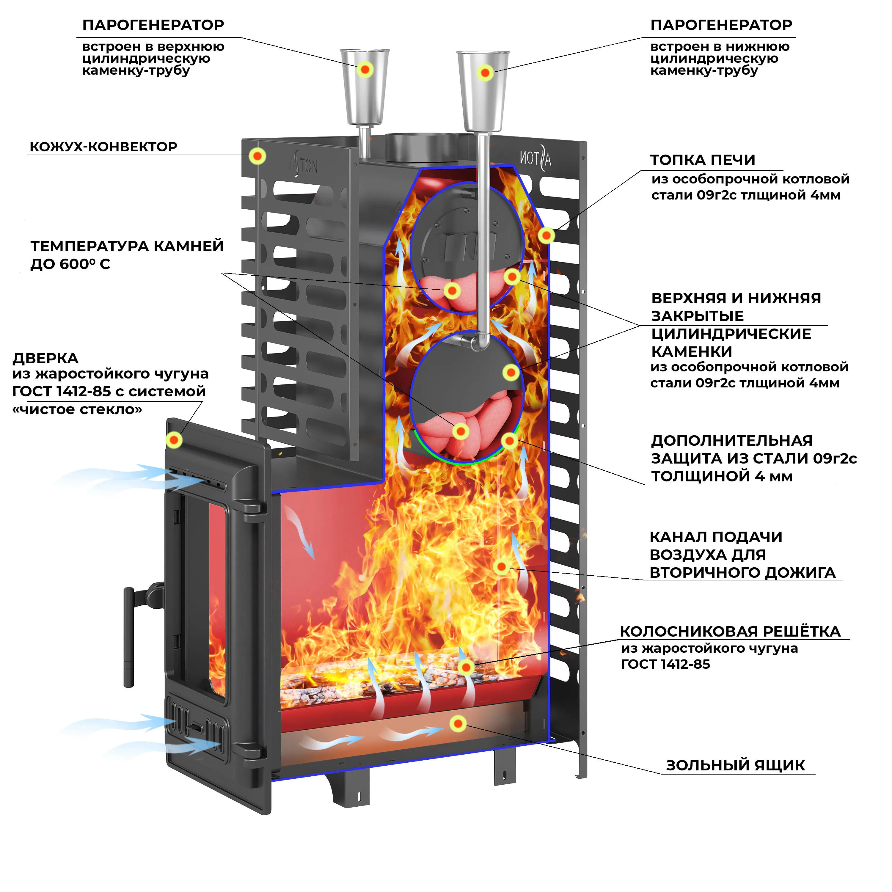 Главное: Особопрочная котловая сталь 09Г2С. Запатентованная конструкция. Специально сконструированная дверка. Лучшая в своем сегменте цена. ASTON — бренд банных печей для бюджетных парных и бань-бочек. Несмотря на доступную цену, их конструкция очень интересна: они изготовлены из стали повышенной прочности 09Г2С; имеют закрытую каменку для получения легкого пара; это печи-каменки с сеткой-кожухом для камней. Детали: Стальной кожух-конвектор значительно ускоряет нагревание воздуха в парилке за счет образуемого им мощного воздушного потока. Топочная дверка с регулировкой подачи воздуха. Универсальный парогенератор проходит через каменку-трубу, обеспечивая получение мелкодисперсного пара. Глубокая невентилируемая каменка-труба из стали 09Г2С толщиной 4 мм и усилена листом метала толщиной 4мм, прогревается открытым пламенем для максимального нагрева камней, заложенных в нее и выполняет роль пламегасителя. Большая масса камней, закладываемых в сетку-кожух печи, обеспечивает стабильность температуры в парилке и является мощным парогенератором. Длинная колосниковая решетка из массивного литьевого чугуна обеспечивает равномерное и мощное горение дров. Съёмное дно топочной камеры облегчает уход за печью и контроль состояния поддувального пространства.