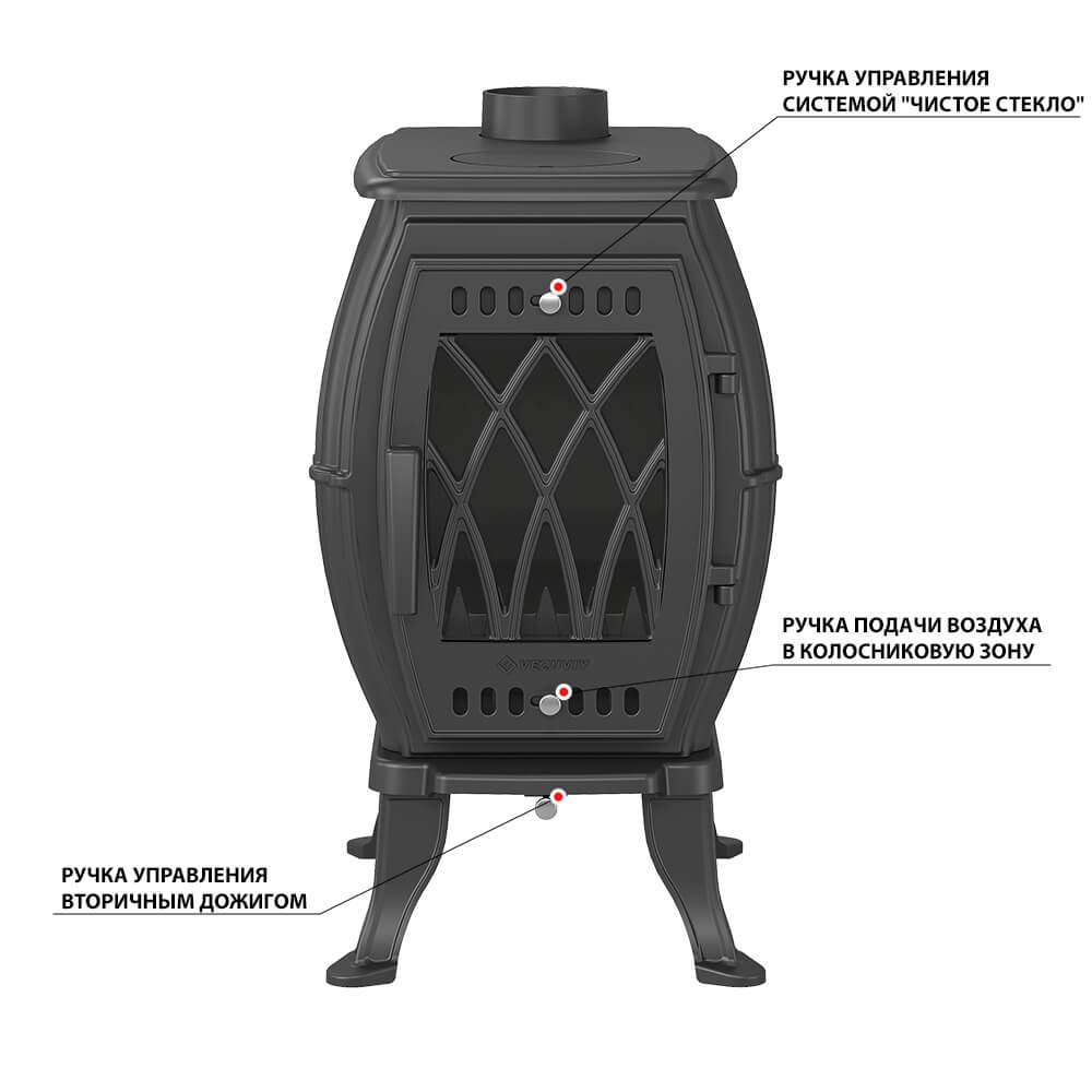 Регулировка подачи воздуха в колосниковую зону осуществляется заслонкой, расположенной в нижней части двери. В верхней части двери расположена ручка регулировки системы чистое стекло, которая помогает оставаться стеклу чистым.